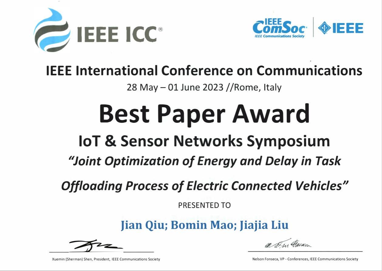 通信领域旗舰会议IEEE International Conference on Communications (IEEE ICC)于2023年5月28日至6月1日在意大利罗马举行。色情网站 刘家佳教授团队的研究成果“Joint Optimization of Energy and Delay in Task Offloading Process of Electric Connected Vehicles”在众多论文中脱颖而出,获得了本次大会最佳论文奖。该论文色情网站 为唯一署名单位,论文作者分别为色情网站 研究生裘坚,及其导师毛伯敏教授和团队负责人刘家佳教授,这是色情网站 首次获得IEEE ICC最佳论文奖。