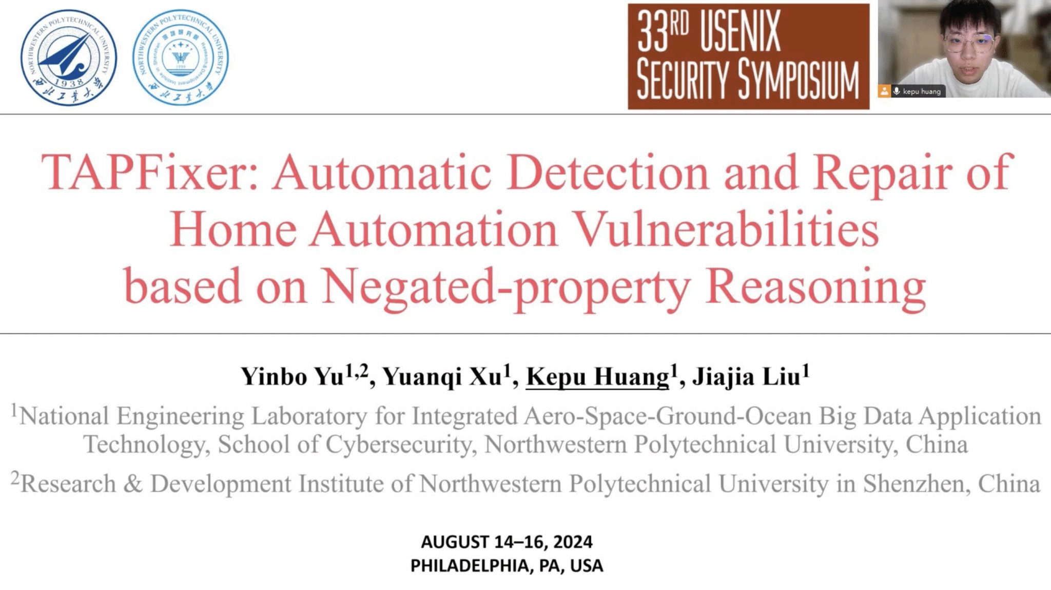Yinbo Yu, Yuanqi Xu, Kepu Huang, and Jiajia Liu. “TAPFixer: Automatic Detection and Repair of Home Automation Vulnerabilities based on Negated-property Reasoning”. USENIX Security 2024.
