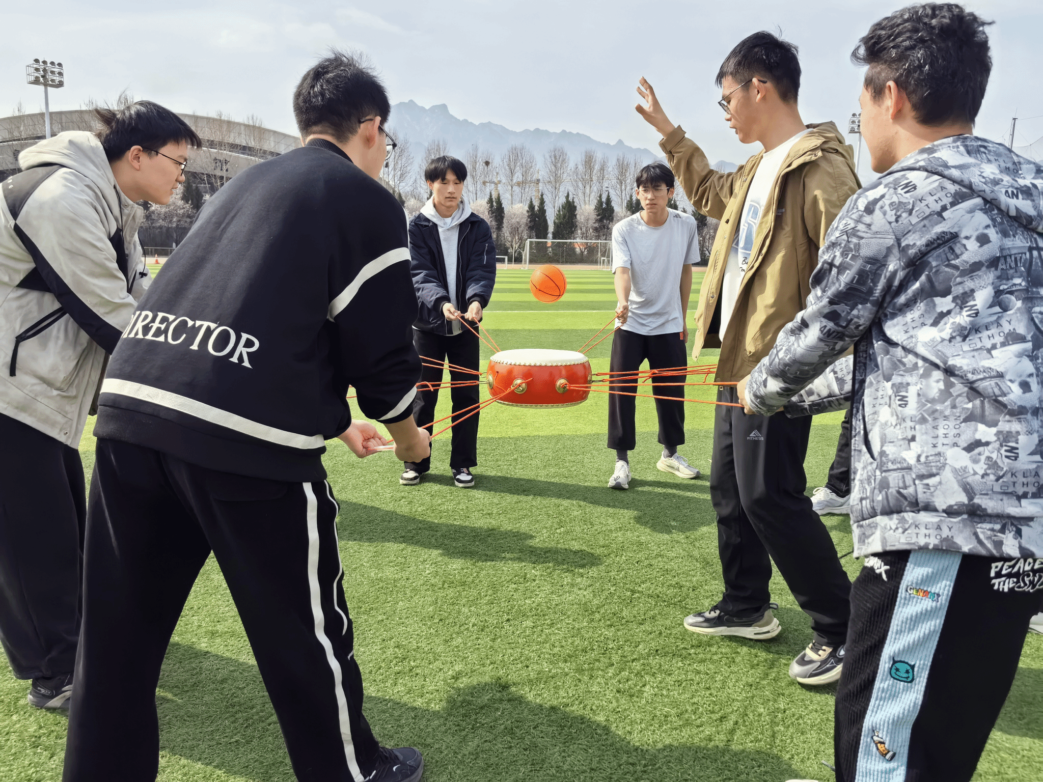上午10时,本届院运会的鼓动人心项目在星天苑操场举行。该项目由8人构成一支参赛队伍,8人共同控制一张牛皮鼓,利用鼓面击球,保持球不落地,每支队伍共有两次机会,取两次颠球中连续颠球数量最多的一次计数,若球落地,则比赛结束。队员们如浪潮般起伏移动,皮球也在牛皮鼓面上震颤,飞旋的球影与齐声呼喊的节拍共振,牵动着队员们的呼吸。最终DL062446班完成颠球94个,荣获冠军;DL062447班完成颠球82个,荣获亚军;DL062449班完成颠球22个,荣获季军。