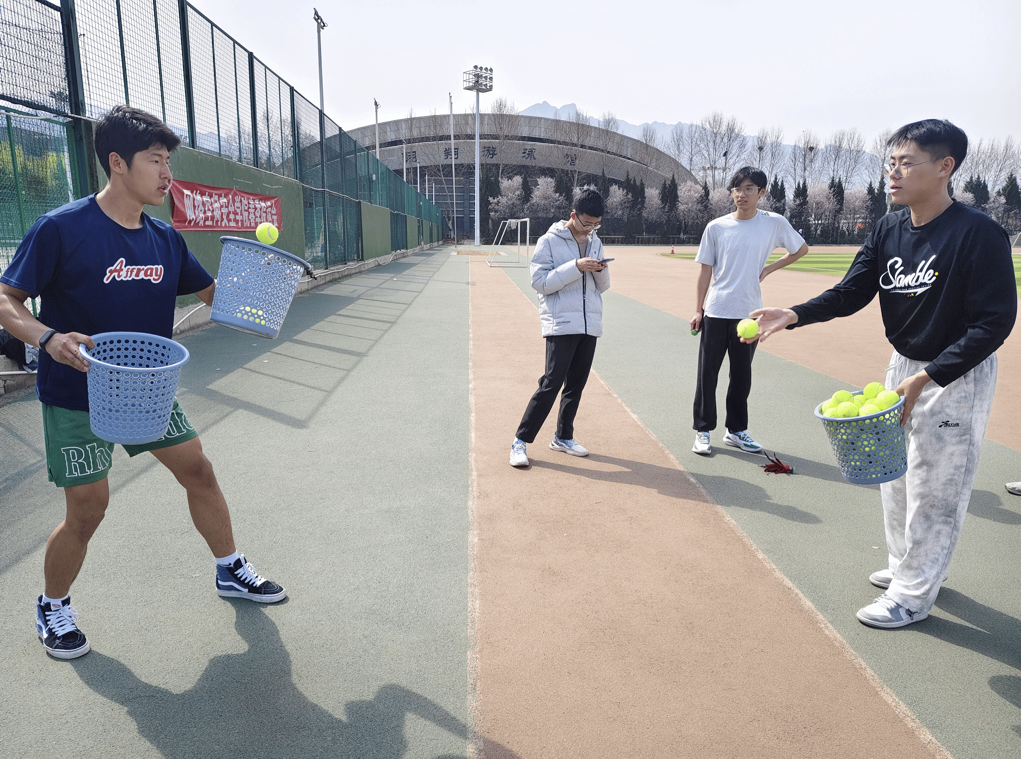 上午9时,本届院运会的花样投球项目在星天苑操场举行。这项赛事中,参赛者两两一组,一方使用数量足够多的网球,在30秒内尽可能多地将球投进另一方手持的球框中,投进球数最多者获胜。投球者快速跑动、跃投、调整抛物线角度,接球者则动态移位、稳托球框预判落点,双方都展现出了高度的战术默契。最终,张泽君和孙博书同学共投进41个,荣获第一名;买拉木别克·也尔哈布力和张杰铭同学共投进39个,荣获第二名;杨雅雯和易丁琪同学共投进34个,荣获第三名。