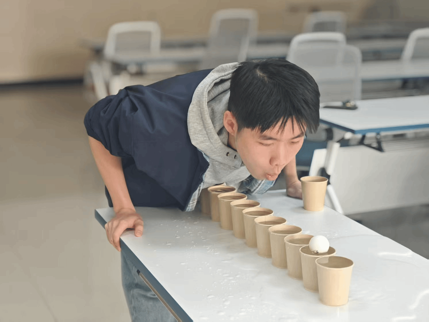 楼101举行。这项赛事中,运动员需要使用吹气方式使乒乓球依次通过5个盛水纸杯(间距50厘米),掉落需放回重试,计时最短者胜。运动员屏息俯首,用呼吸操控着乒乓球在湿滑杯沿间跃进,飞溅的水珠与倒计时器上的数字同步震颤。最终,徐瑞同学荣获冠军,黄远鑫同学荣获亚军,张恩玮同学荣获季军。