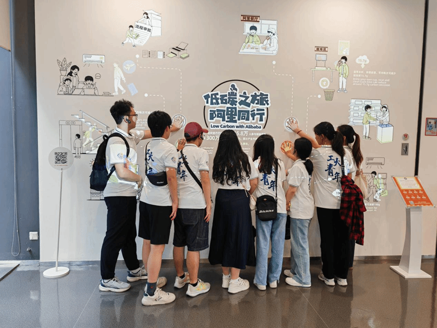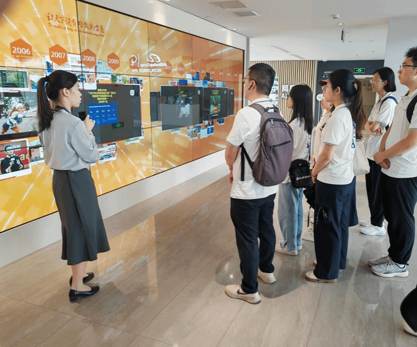 在淘天集团访客中心展厅,讲解员为实践队师生带来了一场精彩的企业发展历程讲解。从1999年阿里巴巴创立之初的创业故事,到如今发展成为全球领先的互联网科技企业,讲解员通过详实的数据和生动的案例,系统梳理了集团的发展轨迹,特别重点介绍了淘天集团作为阿里巴巴核心业务板块的战略定位,以及在电商平台技术创新、AI应用研发等领域取得的突破性进展。通过展厅内丰富的图文资料、互动展示和实物展品,同学们不仅了解到阿里巴巴"让天下没有难做的生意"的企业愿景,更深刻感受到其在科技创新、社会责任等方面的卓越实践。淘天集团独特的"战袍文化"、充满人文关怀的"阿里日"、践行绿色发展的"低碳行动"以及激励员工成长的"年陈文化",都给师生们留下了深刻印象,让大家真切体会到头部科技企业的文化魅力与社会担当。
