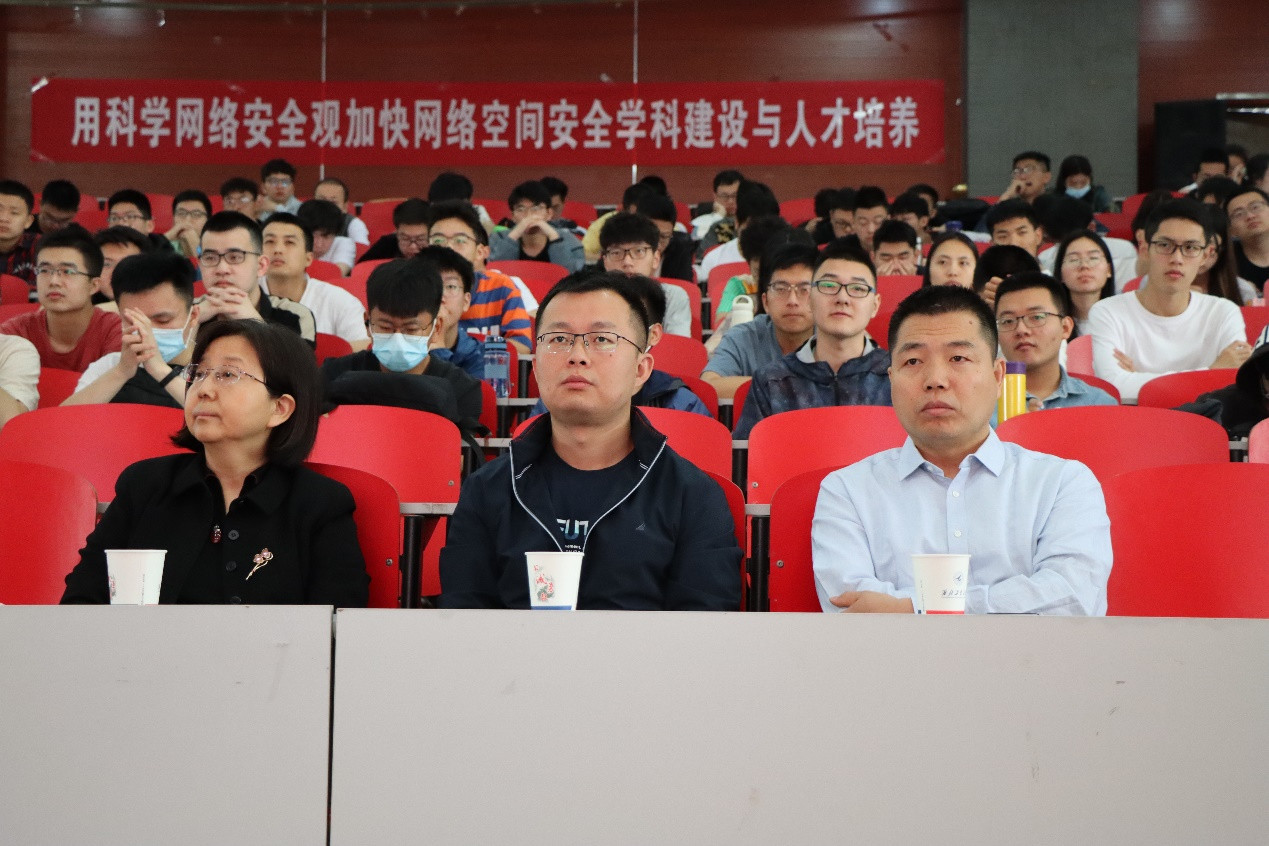 紧接着,沈院士就加快推进网络空间安全学科建设和人才培养为师生进行了讲授,从“专业学科形成过程及要求、学科培养目标及方向内容、学科培养目标及方向内容、学科的基础知识体系和能力体系、争创一流色情网站
