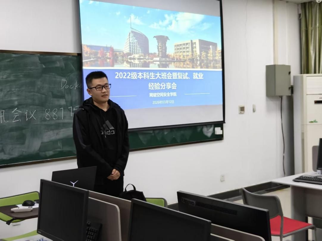 在104教室召开2026届本科毕业生就业、复试经验分享会暨2022级本科年级大班会。本次活动由辅导员王昌昌主持,邀请了多位优秀学生代表分享就业与复试经验,全体2022级本科生参加。活动旨在通过朋辈引领与精准指导,助力毕业生走好升学就业的“最后一公里”。