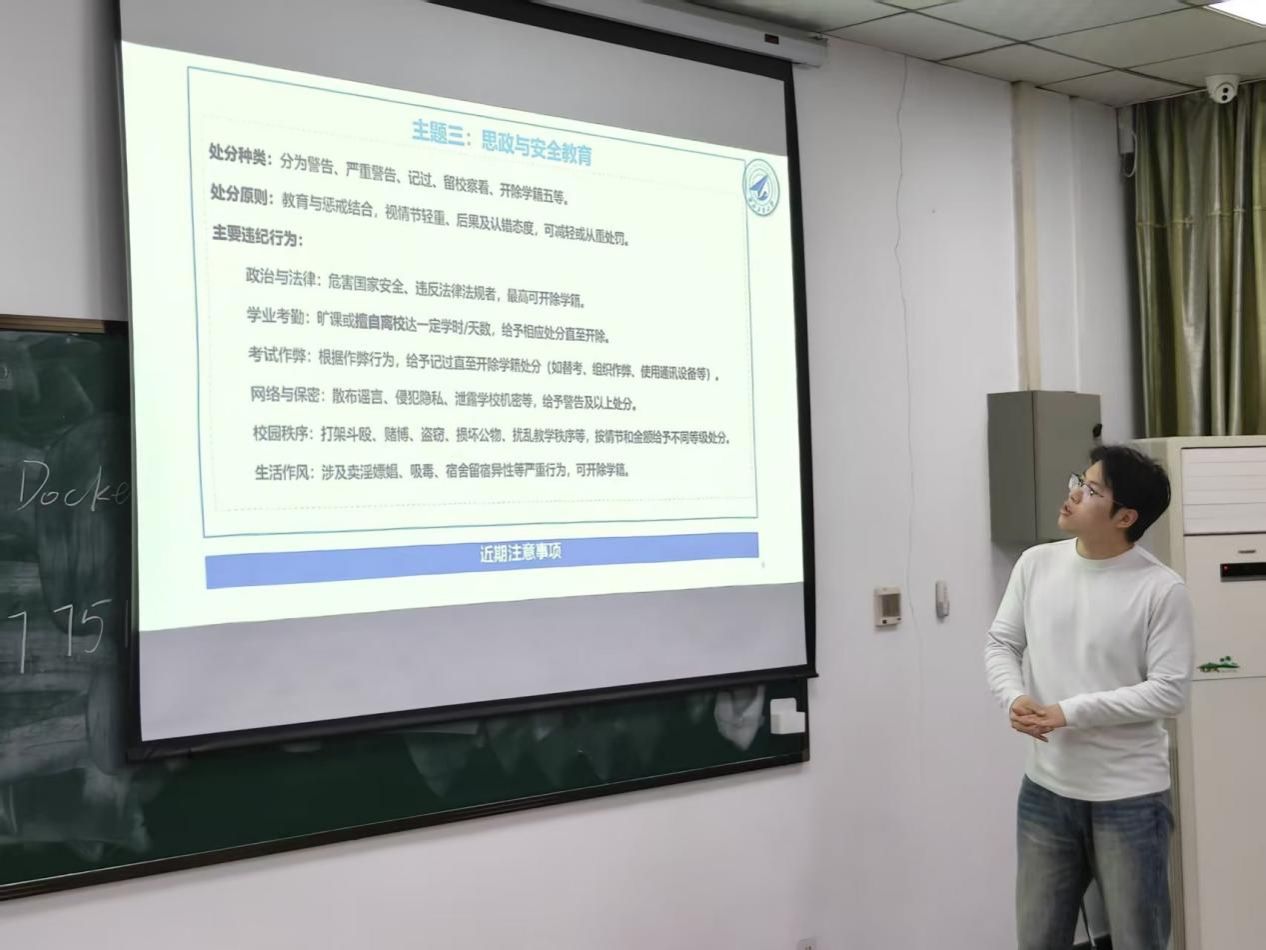 辅导员王昌昌老师则重点强调了毕业设计的重要性,提醒同学们合理安排时间,确保毕设进度与质量。他还就第二学士学位和科研助理等政策信息进行了详细解读,为有不同发展需求的同学提供更多选择路径。