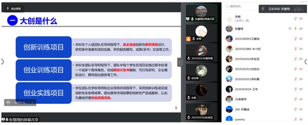 首先,院长助理张慧翔老师对大学生创新创业训练计划做了全面介绍,就大创项目的申报流程以及申报书撰写时的注意要点进行了详细解读并给予相关建议。