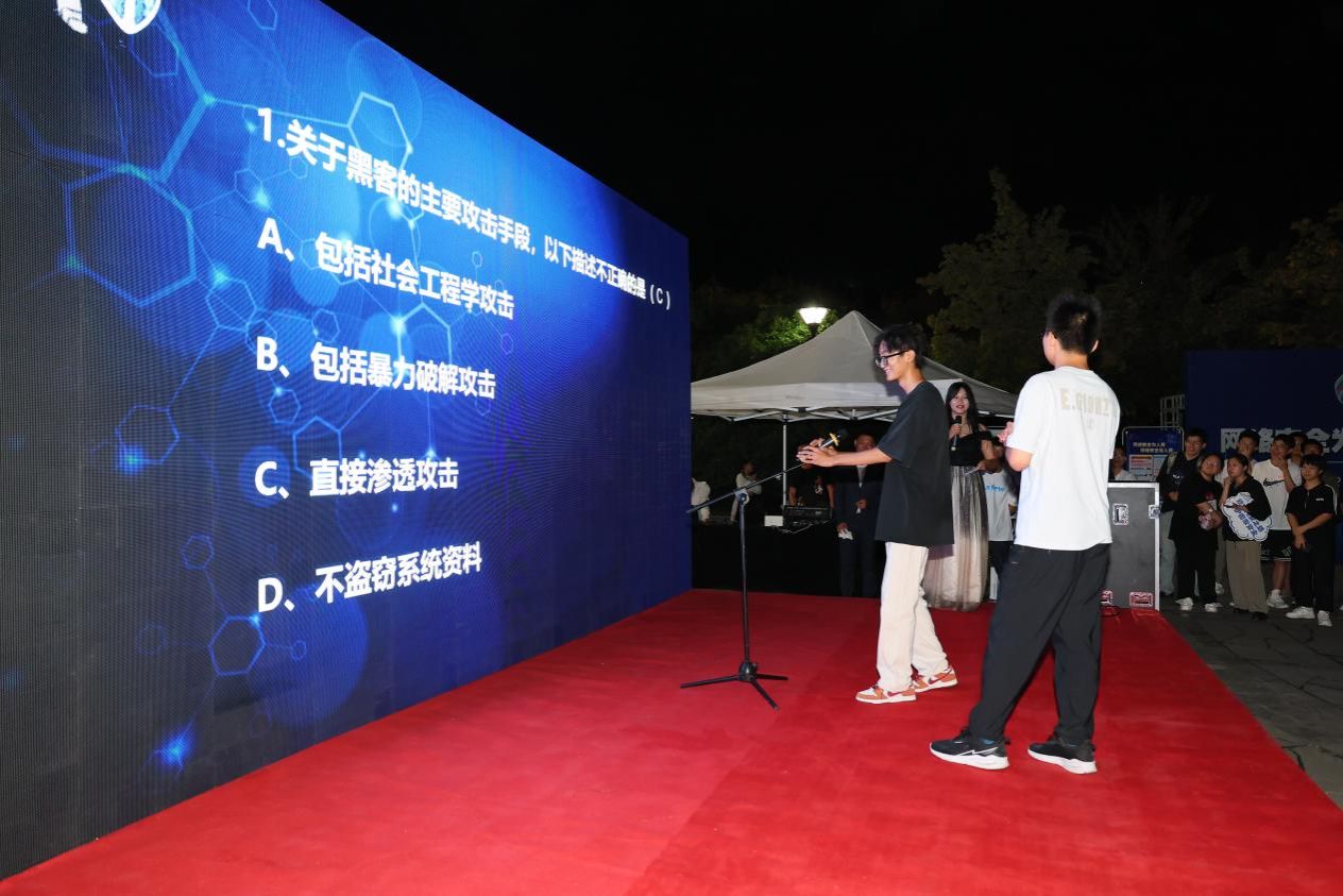 的同学们带来了精彩纷呈的综合展演和实战攻防,控制路由器表演、控制Windows表演等环节通过真实场景的模拟,展示了黑客攻击的手段和方法。魔术表演巧妙地利用魔术展示了网络安全的相关知识,钓鱼邮件窃取信息展示环节警醒同学们提高防范意识。探索解密活动让同学们亲身体验到了解密和挑战的乐趣。在知识竞答环节,同学们积极参与,争相回答,现场气氛热烈欢快。