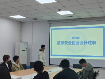 第四项,学生信息安全协会会长述职。学生信息安全协会会长在会上提到了协会举办或参与的多场网络安全知识讲座和技能培训活动,有效提升了学生的网络安全意识和实际操作能力。这些活动不仅为学院营造了浓厚的学术氛围,也丰富了同学们的课余生活。此外,协会还积极参与了国内外的网络安全竞赛,取得了不俗的成绩,为学院赢得了多项荣誉。他表示协会将继续致力于提升同学们的网络安全意识和实战能力。