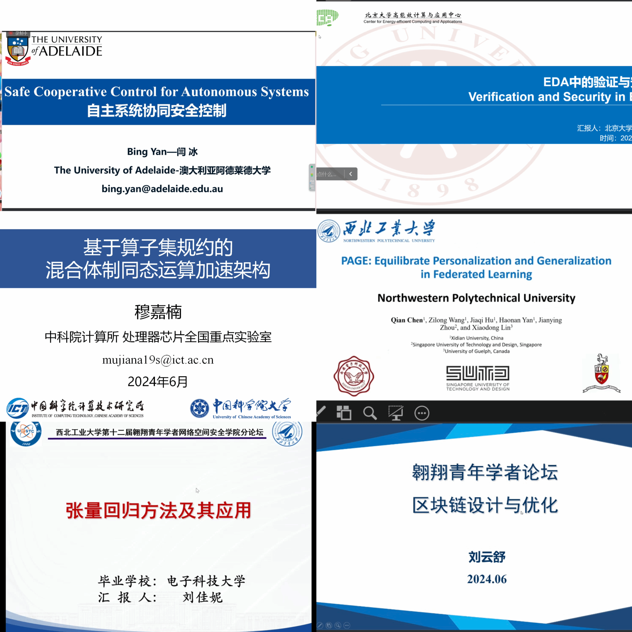 Following this, six young scholars from the University of Adelaide, the Singapore University of Technology and Design, Peking University, and other institutions presented their academic reports. The topics included "Collaborative Security Control for Autonomous Systems," "Verification and Security in EDA," "Accelerating Homomorphic Computation for Hybrid Schemes Based on Operator Set Normalization," "PAGE: Equilibrate Personalization and Generalization in Federated Learning," "Tensor Regression Methods and Applications," and "Blockchain System Design and Applications." Attendees engaged in lively discussions on the content of these reports, showcasing their insights in their respective academic fields.