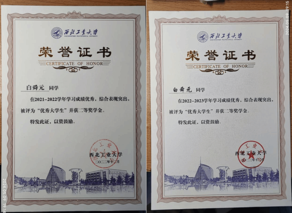 在学业成绩方面,白舜元积极进取,刻苦钻研,多次获得奖学金和表彰,体现出良好的学业能力和扎实的专业素养,积极进行主动思考,善于发现和解决问题,七成以上的成绩取得了90+的成绩,依靠优异的学习成绩,获得了历年的奖学金以及荣誉称号。