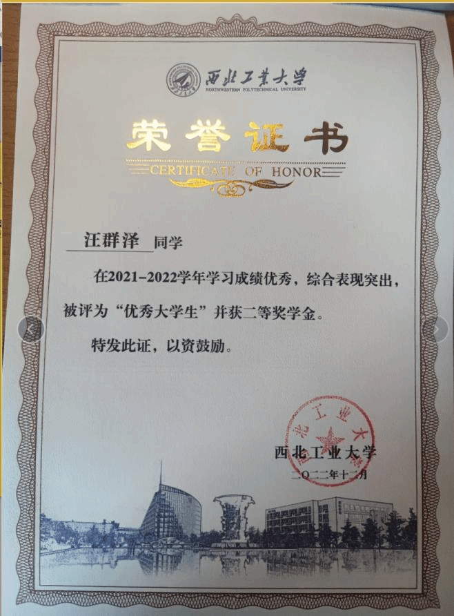 在学业成绩方面,汪群泽覃精毕思,砺剑笃行,本科四年打下了坚实的专业基础,培养出了优良的学术素养,二十余门课程成绩均在90分以上,平均学分绩达到了86.9分,依靠优异的学习成绩,获得了校设二等奖学金以及荣誉称号。