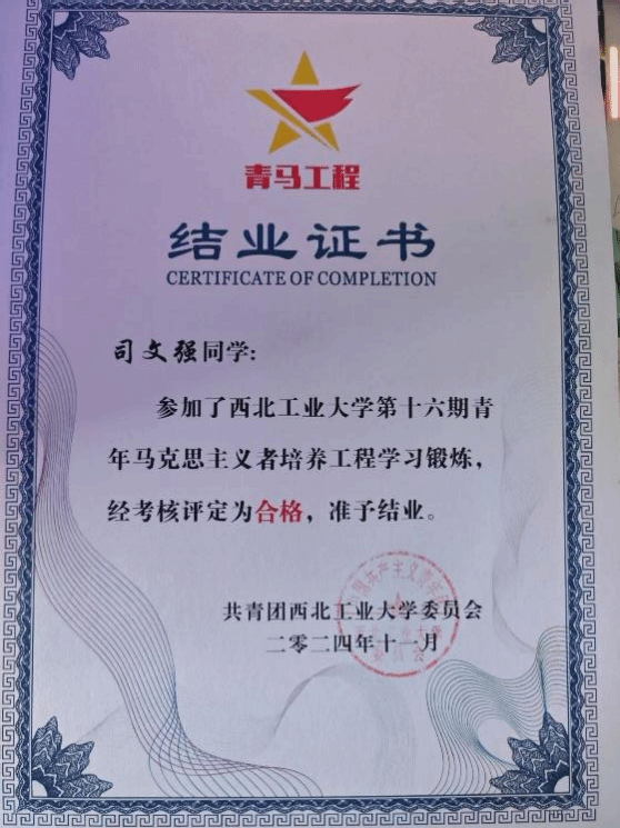 心怀报国之志,不忘来时初心。司文强刚入学便向党组织递交了入党申请书,积极向党 组织靠拢,并于2024年5月13日正式成为一名中共党员。他积极参与各类活动,如青马工程骨干培训班、党员读原著等。在担任班长期间,积极发挥党员的先锋模范作用,切实为同学办实事。