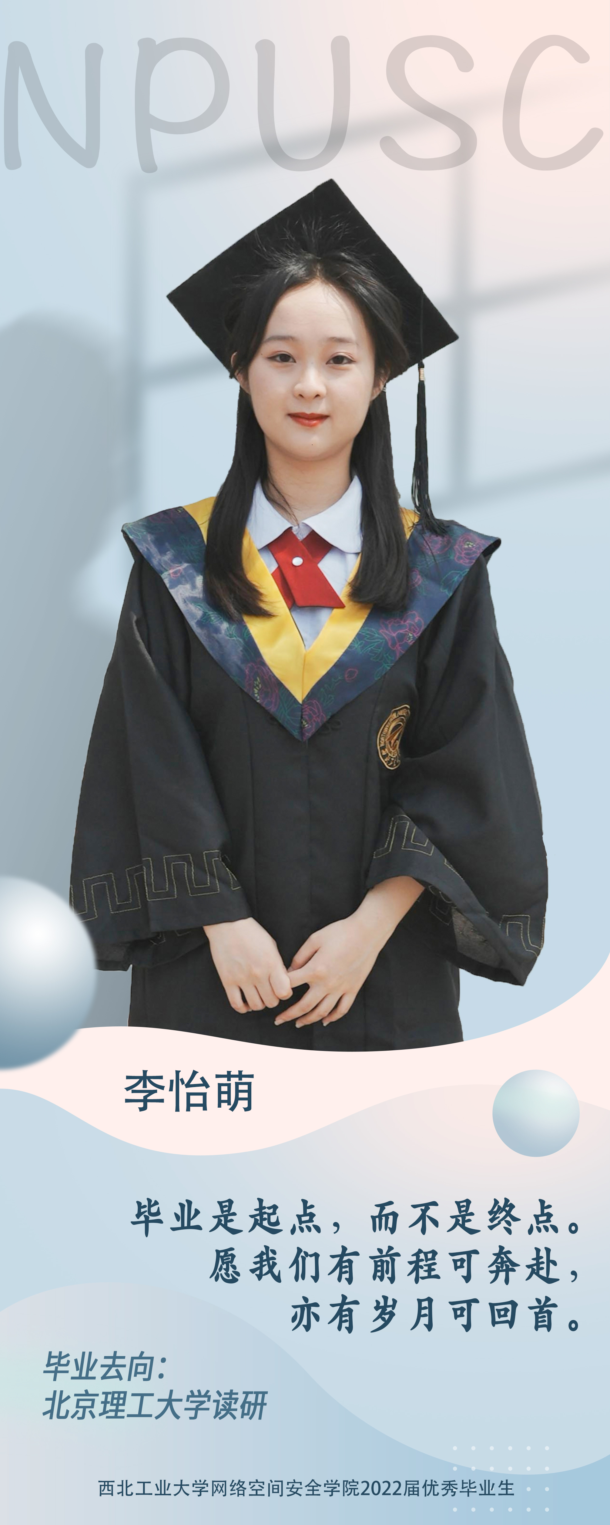 学院2018级本科生李怡萌,本科期间曾获得“中航技”专项奖学金、多次被评为校优秀学生并获得相应奖学金。她积极参加各类学科竞赛,曾获得美国大学生数学建模竞赛一等奖、中国机器人大赛无人机挑战赛一等奖等。参加一项省级大学生创新创业计划,申请两项计算机软件著作权。她积极参加社会实践活动,曾参加赴陕西陇县的扶贫实践活动,负责管理团队开销。