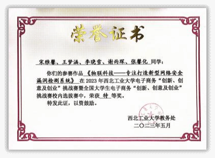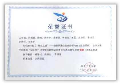 2023年“互联网+”大学生创新创业种子项目1项。立足本专业,带队参加“互联网+”大学生创新创业大赛、电子商务“创新、创意及创业”挑战赛、“翱翔杯”研究生电子设计大赛、“三航杯”大学生课外学术科技作品竞赛等,累计获得国家级三等奖1项、省部级一等奖1项、二等奖2项、校级特等奖1项、二等奖2项、三等奖5项。获国家奖学金、小米优秀专项奖学金、校设一等奖学金等,连续两年获评校级优秀研究生。