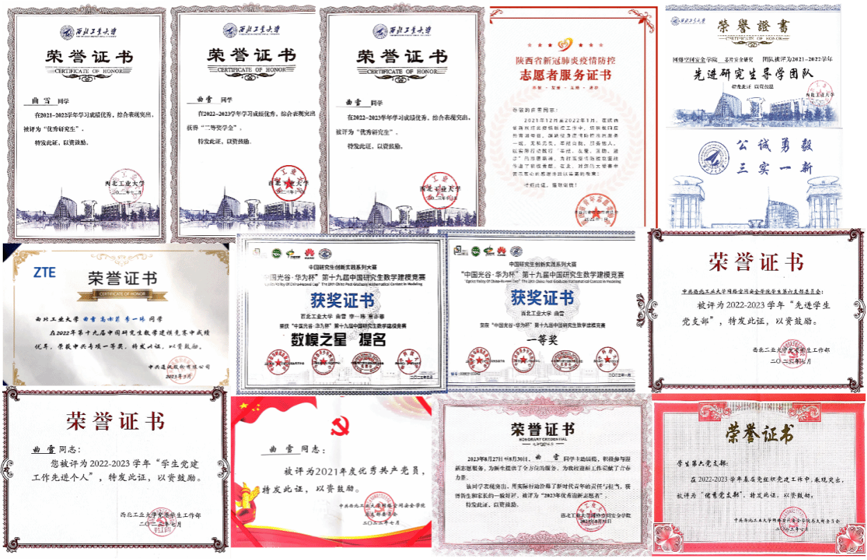 “优秀研究生”,获校级奖学金。面向国家安全重大战略需求,在导师和团队老师引领、同门配合下,曲雪积极参与科学研究,参加国家重点课题2项,发表论文2篇,专利1项,软著1项。同时,参与教材编写,担任本科生专业课程助教,并踊跃参加实习实践交流活动,不断更新知识、拓宽视野,提升自身能力。此外,曲雪多次参加学科竞赛并均取得优异成绩。在第十九届“华为杯”研究生数学建模竞赛中从近1万8千支队伍中脱颖而出,获国家一等奖(获奖比例为1.10%),中兴专项一等奖(仅两队),数模之星提名奖(获奖比例为0.067%)。