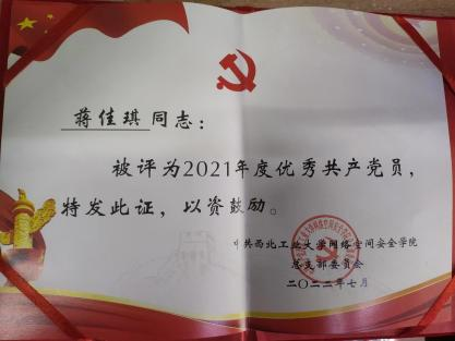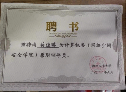 2021级硕士研究生,网络与信息安全专业,师从张慧翔副教授,2021级硕士兼职辅导员,毕业去向:国家开发银行陕西分行。 |