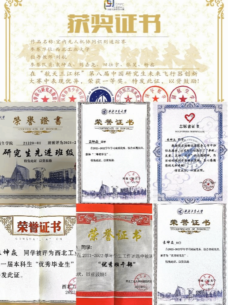 除了在社会工作方面的卓越表现,袁坤焱同学在科技竞赛中也取得了令人瞩目的成绩。作为团队队长,她带领团队参加了第八届中国研究生未来飞行器创新大赛,凭借出色的创新能力和团队协作能力,获得了挑战赛道第一名的优异成绩,为学校争得了荣誉。