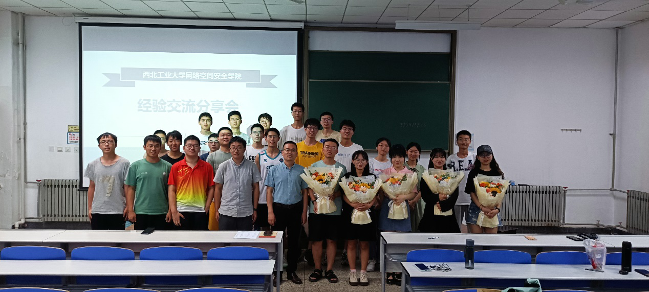 会上,同学们进行了良好的互动交流,学弟学妹们向优秀学长学姐送上了祝福的鲜花。五位学长学姐手捧鲜花与提问的同学合影留念。在欢声笑语和对未来的憧憬思考中,分享会圆满结束!
