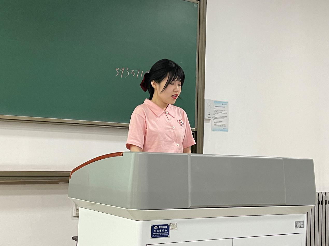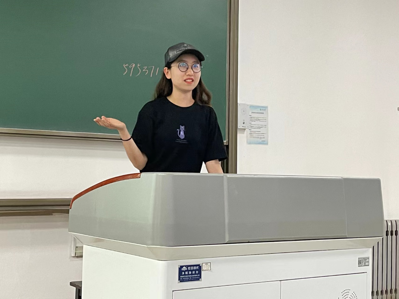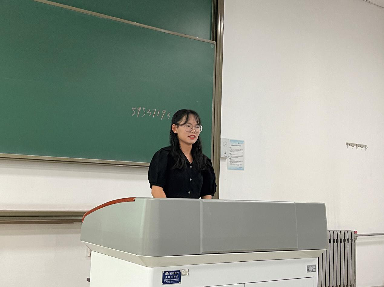 接着姜天琪学姐上台做了分享。她主要从学业方面给了学弟学妹们很多建议,针对一些重要的课程给出了自己的一些经验教训。姜天琪特别介绍了自己从一个普通学生,通过分析个人问题不足,迎难而上,认真踏实学习从而成为年级学业综合排名前茅经历,给出了个人心得体会,让同学深受感染和鼓舞。