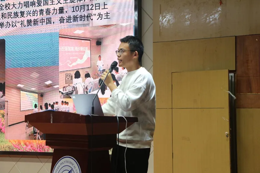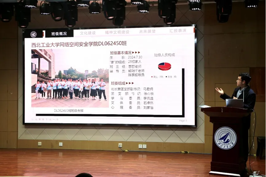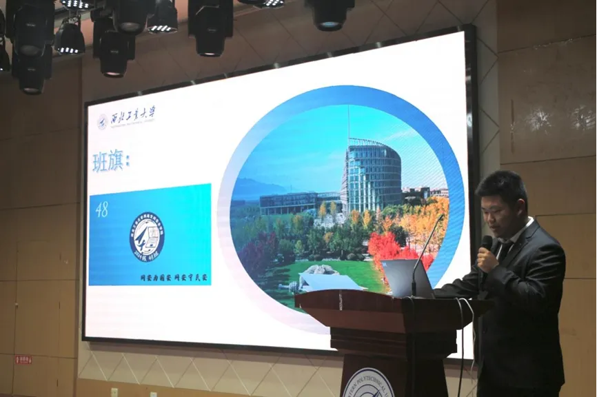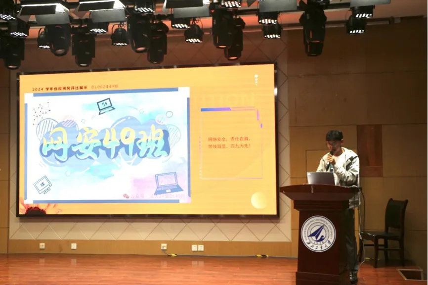 主持人介绍完比赛规则后,各个班级按照抽签顺序,现场依次进行班级文化建设汇报和班级风采展示。班级文化建设汇报中,各班主要介绍了在班委构成、班级风气、班训、班徽、班旗以及班级活动等方面的建设成果。班级风采展示环节各班通过歌唱班歌、表演节目等多种形式,生动地展现了各自班级的特色和风采,呈现出多元而丰富的班级生活以及团结向上的班级氛围。最后,学院党委副书记杜瑶对风采大赛进行了点评总结,充分肯定了各班在开学两个多月以来开展的丰富多彩、积极向上的班级活动,希望同学们将班级文化建设为契机,在未来的大学生活中团结友爱,不断超越自我,为筑牢祖国第五疆域贡献力量。