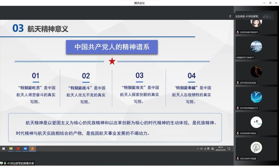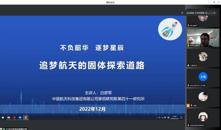 思政课以线上会议的形式进行,白总师以“追梦航天的固体探索道路”为题,结合中国航天事业的发展历程,从人类的飞天梦、固体动力简介、用航天精神引领航天探索之路等方面开展了讲课。白总师向广大师生讲述了飞天历程从神话到科学的探索历程,以及我国航天和国防事业(“两弹一星”)的发展、固体发射机研制、发展壮大和稳步前进直到走出独立自主的固体道路的经历。同时,为让广大师生更加了解固体发动机,白彦军总师介绍了固体发动机的基础知识,展示了固体发动机的组成和工作过程以及固体动力的特点、应用、分类等。他表示,固体动力机的发展对于中国航天事业有非常重要的作用。